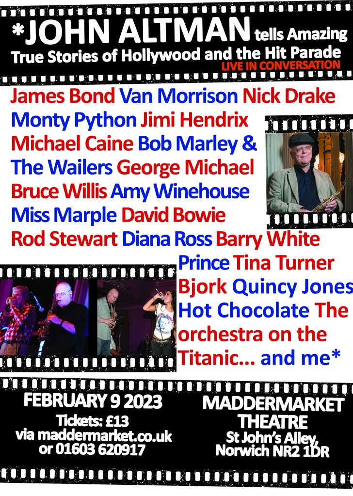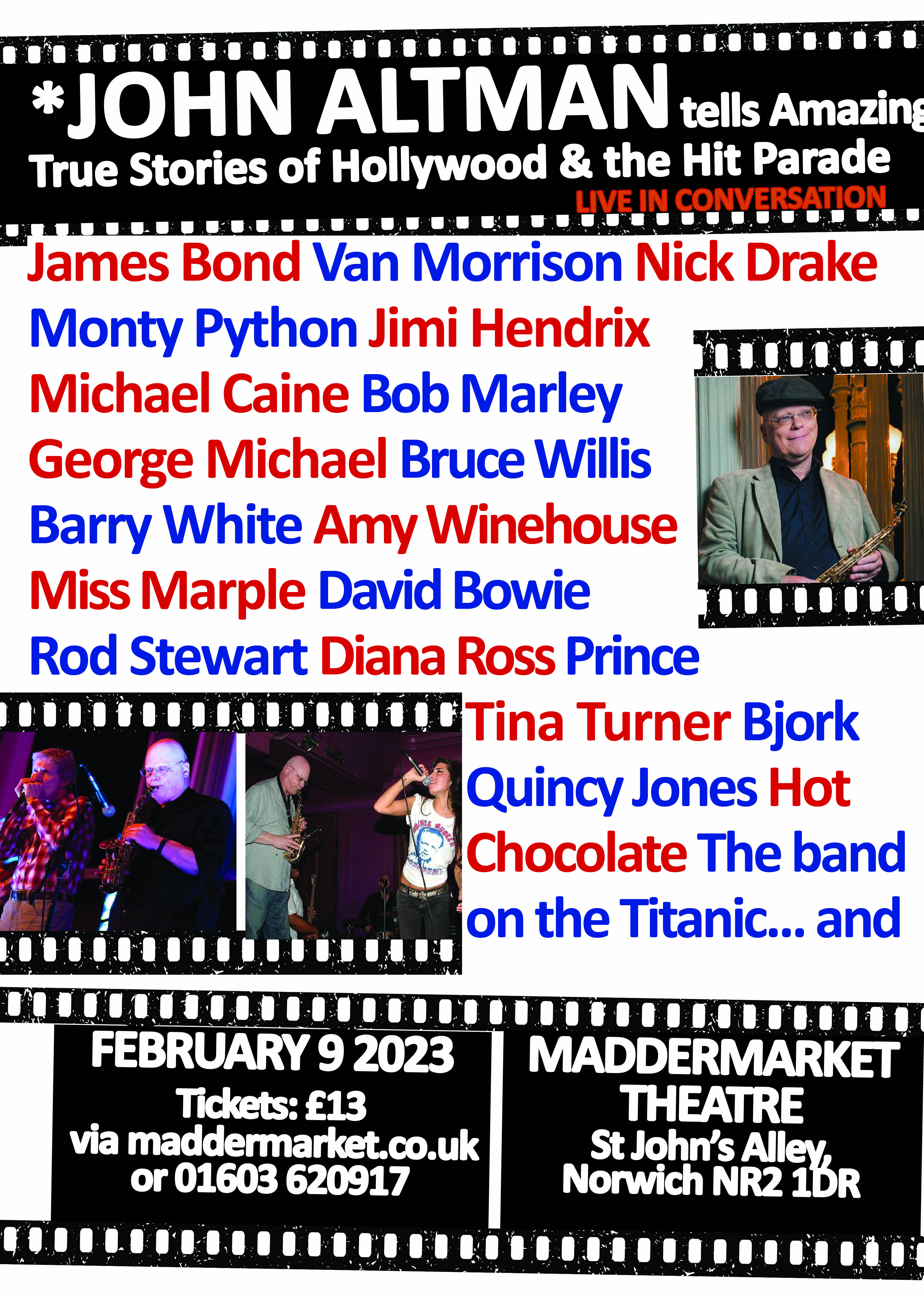 Composer and arranger John Altman joins me for a highly entertaining race through his 50-year career in music and film. John has worked with a surreal who’s who of music and film stars: from Chaplin and Bowie to Prince and Michael Jackson; George Michael, Van Morrison and Diana Ross to Bob Marley, Alison Moyet, Bjork and Monty Python. Expect a hilarious, eye-opening evening, packed with improbable but true stories of the biggest names in entertainment.